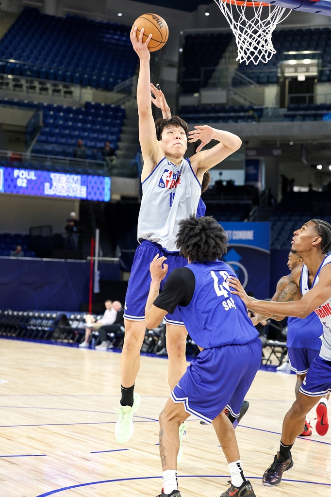 在今年NBA选秀联合试训第一场5v5对抗赛中,杨瀚森登场19分钟7投5中,三分3中1、1罚1中,得到12分1篮板(前场板)2助攻1盖帽,仅1次失误,得分并列队内第三高。而第二场5v5对抗赛,杨瀚森上阵18分钟,4投3中,7罚5中,拿下11分6篮板(3个前场板)6助攻1盖帽的全面数据,出现3次失误。