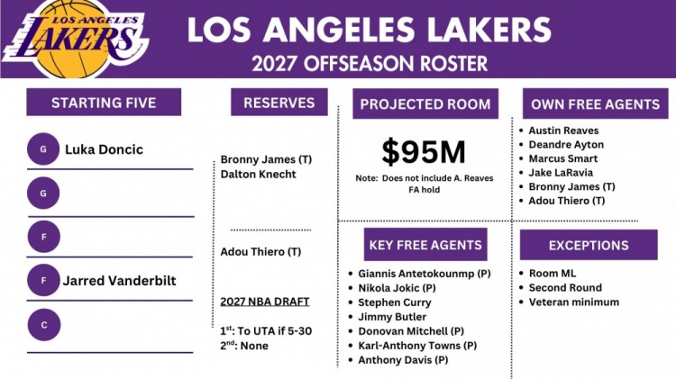 8月7日讯 今天,薪资专家Bobby Marks盘点了湖人2027年夏天的阵容情况、薪资状况以及27年夏天自由市场上的大鱼。