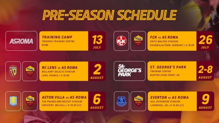 随后,罗马将前往英格兰,于8月2日至8日在伯顿特伦特河畔的圣乔治公园进行集训。在这段训练期间,已安排一场对阵维拉的热身赛,比赛定于8月6日在沃尔索尔的贝斯科特球场举行。