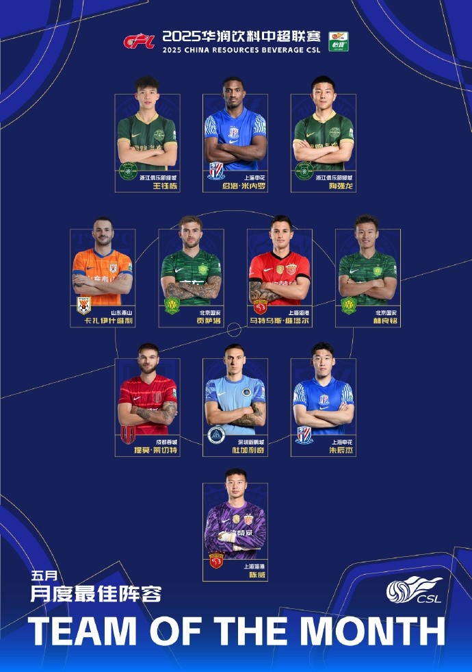 中超5月最佳阵容:王钰栋领衔,浙江、国安、申花、海港各2人入选