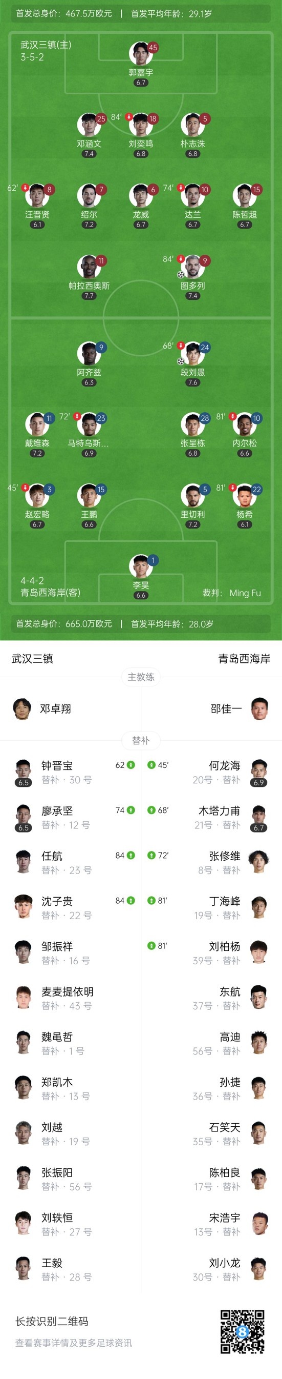 上半场补时6分钟,武汉三镇1-0青岛西海岸。