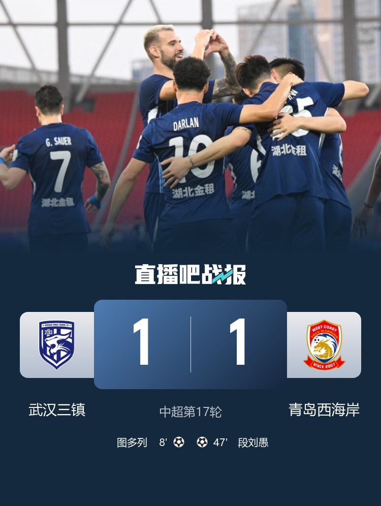 最终,武汉三镇1-1青岛西海岸。